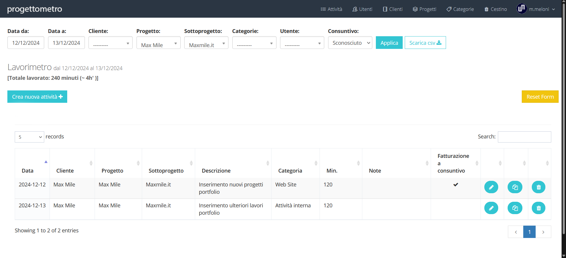 Capacità di filtrare per utente, giorno, cliente e progetto: